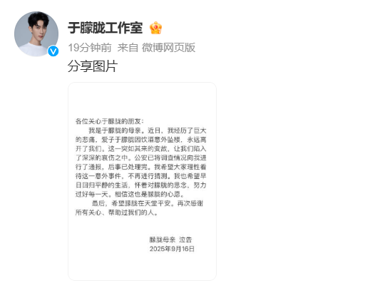 各位关心于朦胧的朋友:我是于朦胧的母亲。近日,我经历了巨大的悲痛,爱子于朦胧因饮酒意外坠楼,永远离开了我们。这一突如其来的变故,让我们陷入了深深的哀伤之中。公安已将调查情况向我进行了通报,后事已处理完。我希望大家理性看待这一意外事件,不再进行猜测。我也希望早日回归平静的生活,怀着对朦胧的思念,努力过好每一天。相信这也是朦胧的心愿。